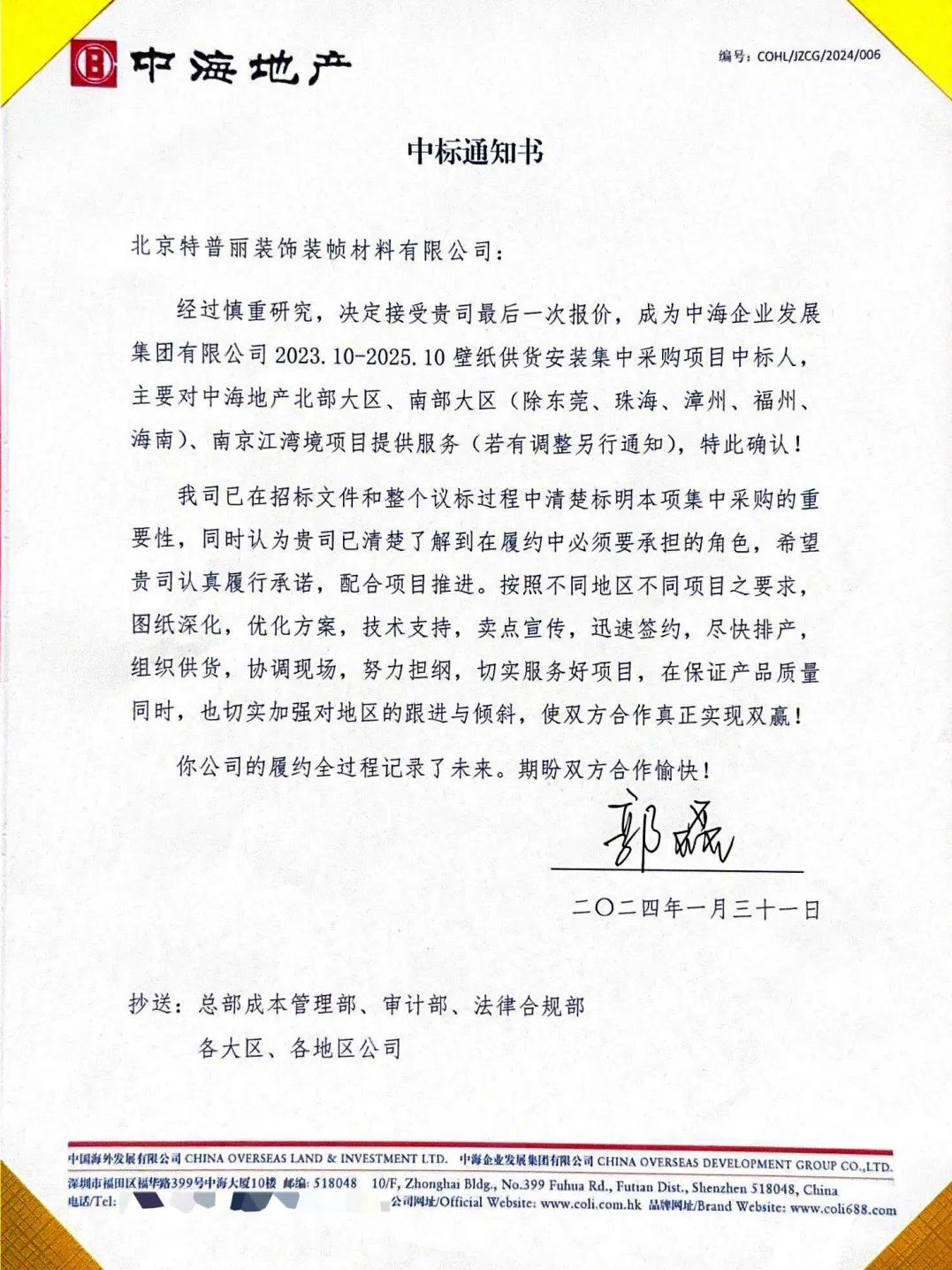 特普麗墻飾以“自有的研發(fā)優(yōu)勢(shì)、優(yōu)質(zhì)的產(chǎn)品質(zhì)量、精誠(chéng)的售后服務(wù)”,與中海地產(chǎn)簽訂了2年的戰(zhàn)略合作協(xié)議,在未來(lái)的2年中,特普麗將不斷創(chuàng)新合作,在各項(xiàng)目的供貨中積極配合,保障項(xiàng)目的良好進(jìn)展和如期交付。在今后的合作中,特普麗將認(rèn)真履行戰(zhàn)略合作協(xié)議,不斷加強(qiáng)自身建設(shè)、注重品質(zhì)保障、共聚合力、共謀發(fā)展。通過(guò)加強(qiáng)合作溝通交流,增強(qiáng)戰(zhàn)略合作意識(shí),同心同向、攜手共進(jìn),共創(chuàng)合作共贏的美好未來(lái)。